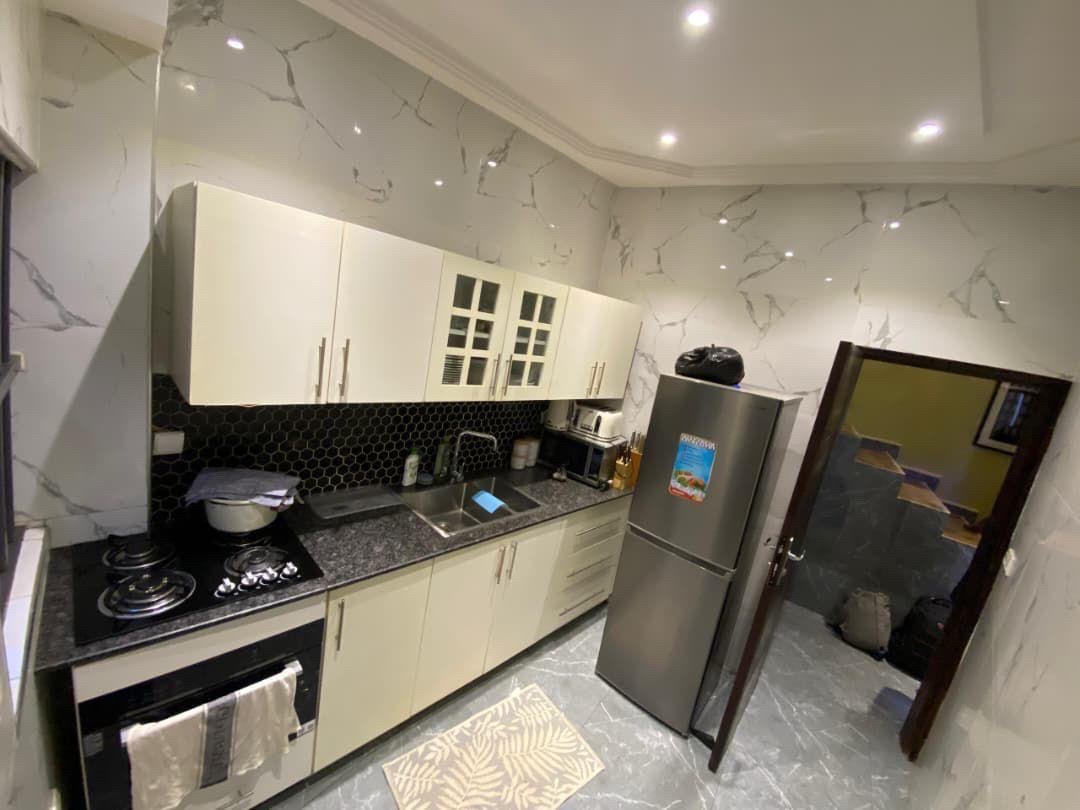 92731010 Mini villa duplex meublée de *trois (03) chambres - salon* cuisine équipée Garage pour une voiture.. Machine à laver *NB* : Toutes les chambres sont à l'étage; le salon et la cuisine au rez. *Lieu : Adidogome Madiba* à 300 mètres du goudron *Loyer mensuel : 500.000f CFA* Caution : 100.000f CFA Visite : 5.000f Prestation d'agence : 25% pour court séjour et un mois pour long séjour